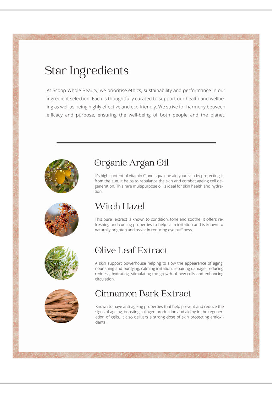 KEY INGREDIENTS: WITCH HAZEL | HYALURONIC ACID | ORGANIC ARGAN OIL | OLIVE LEAF EXTRACT | ROSEMARY EXTRACT | LAVENDER OIL | VITAMIN E